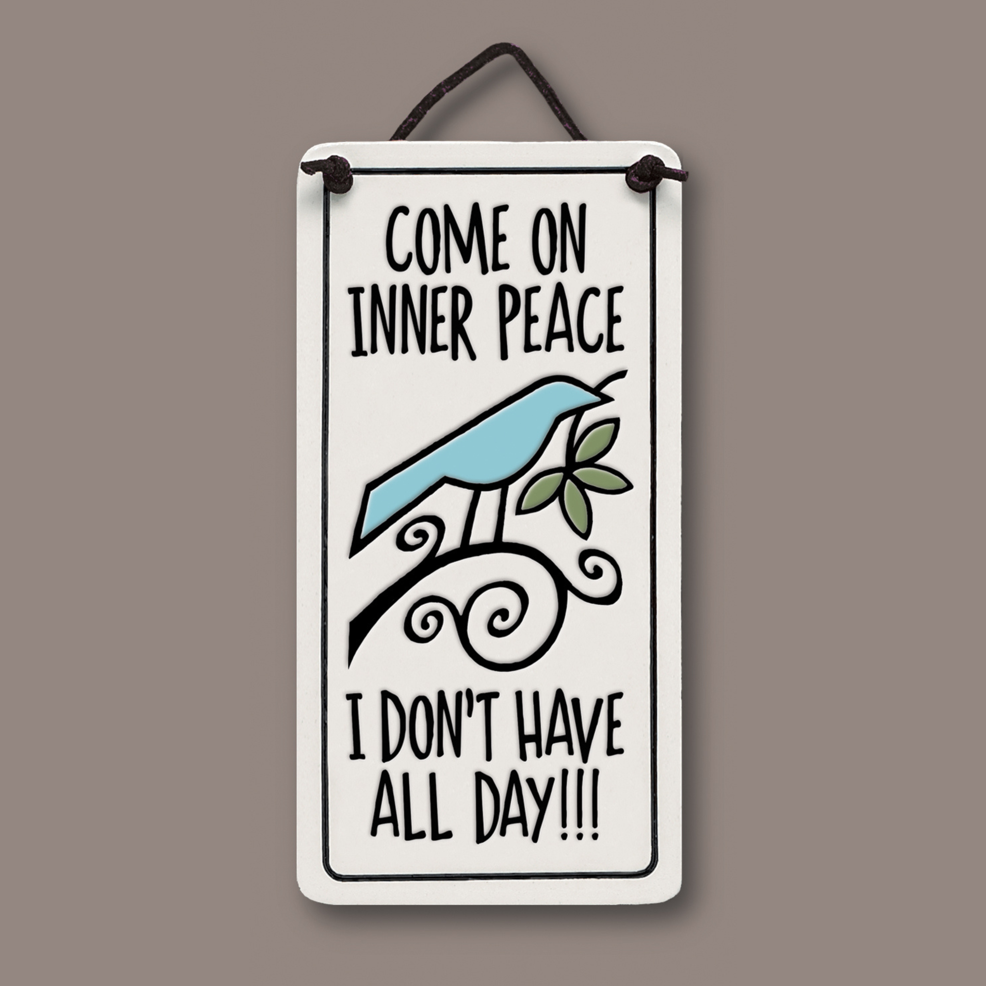 Spooner Creek Mini Charmer with quote, "Come on inner peace, I don't have all day!!" Measures 2.25" x 4".Our hand glazed mini tiles make perfect gifts. Your customers will have an easy time finding one (or three) that remind them of someone in their life. They have a great price point, so they are very easy to sell!