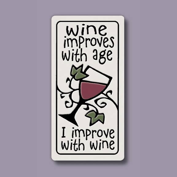 Spooner Creek magnet with quote, "Wine improves with age, I improve with wine". Measures 1.5" x 3.25".