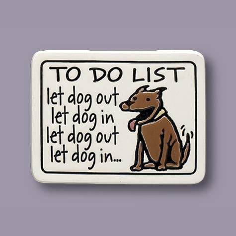 Spooner Creek magnet with quote, "To-Do List: Let dog in, let dog out, let dog in, let dog out." Measures 2" x 2.5"Our clay magnets are all hand glazed and made in small batches. They make the perfect little gift or impulse buy. Your customers are certain to find one (or three) that reminds them of someone they love. Proudly handmade in the United States.