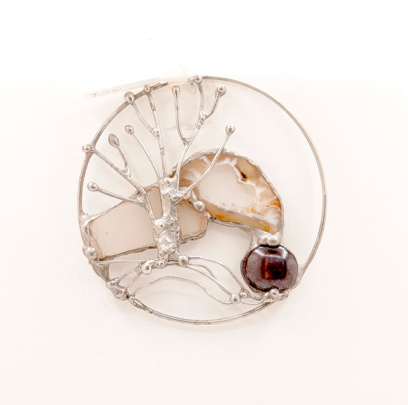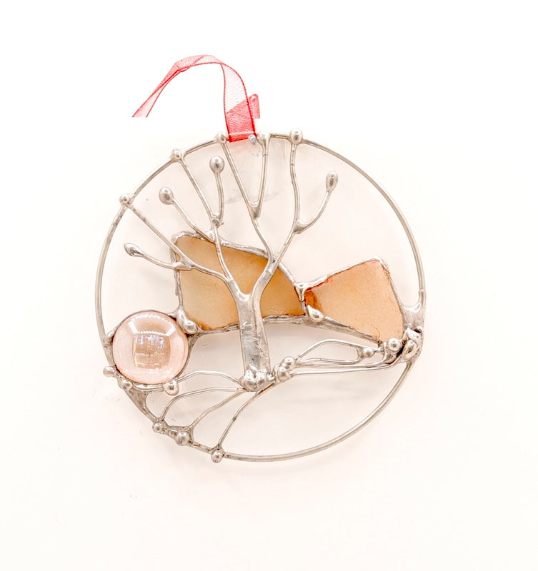 Mini tree made of 3'' diameter wire circle with bits of tumbled glass, glass jewel & hand fabricated wire tree. No two are alike, art nouveau vibes. Ready to hang. Hanging ribbon included.