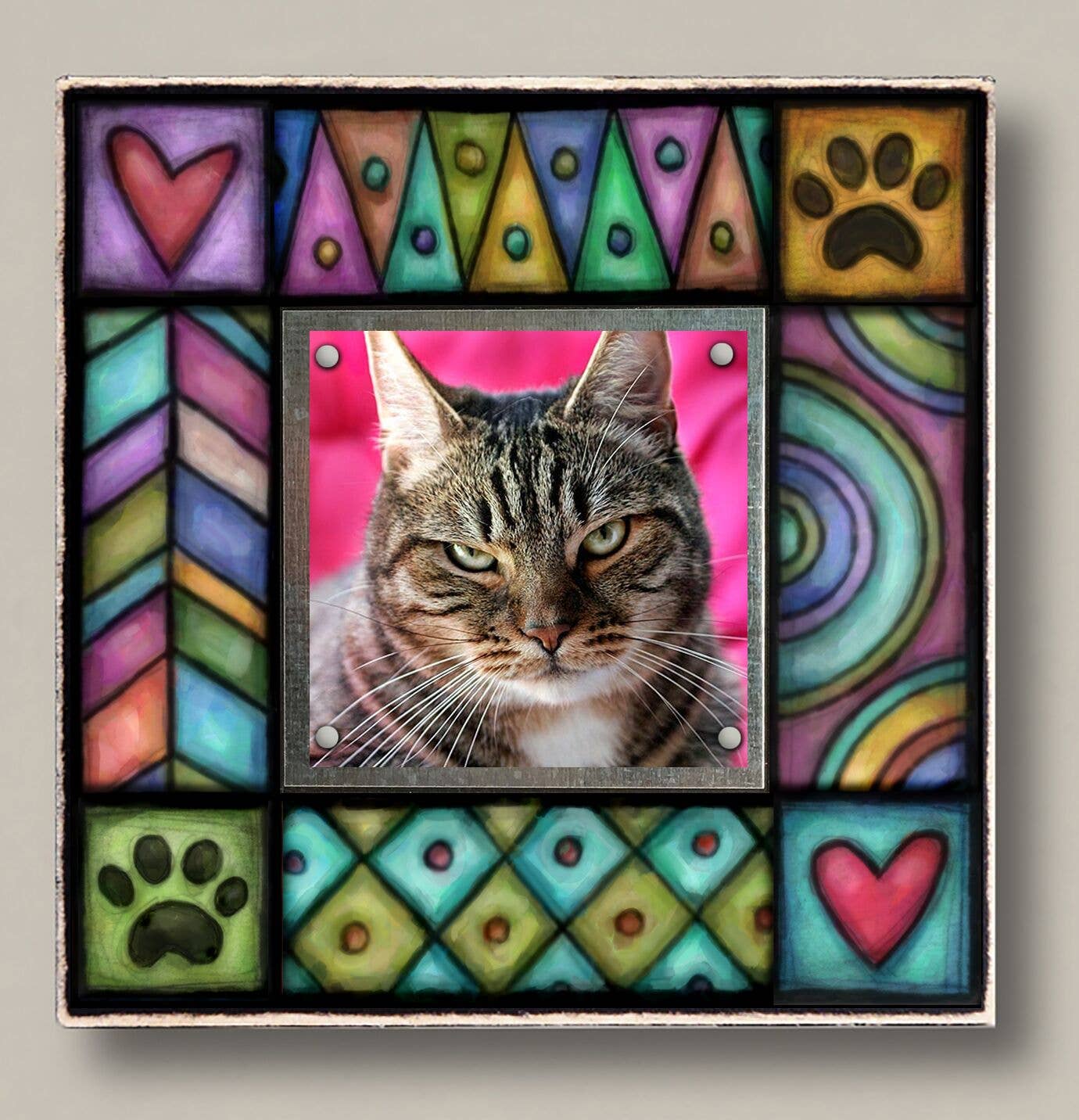 Frame featuring the artwork of Michael Macone with picture of paw and heart. This 5.25" x 5.25" wood frame holds a 2" x 2" photograph on a sheet metal square with four super-strong rare earth magnets. It is printed with archival ink on archival paper which is attached to wood and UV coated to last a lifetime. Frame can hang or stand with included peg.