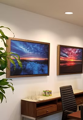 The art displayed in your office, conference room, or waiting area communicates the personality of your business and sets the atmosphere for employees and clients. Our experienced and creative staff will help you represent your brand and business through the artwork on your walls by working with you to choose the best pieces and designing the framing that will highlight the work perfectly. We also provide delivery and installation services.