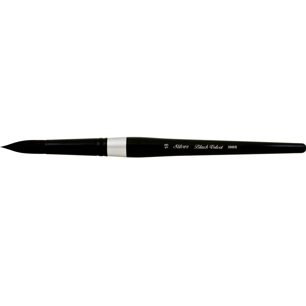 Our unique blend of natural squirrel hair and black synthetic filament creates ideal working tools for the watercolorist, silk painter, and artists working with inks, dyes, acrylics or gouache. Squirrel hair holds large amounts of color and releases it with perfect control. By itself, squirrel is delicate. So we blended it with a synthetic to resist wear and maintain a wonderful snap and spring. This soft blend allows multiple layer glazing without disturbing previous colors, yet its firm enough to lift color with a gentle scrub. Black Velvet features polished black ferrules, carefully fitted to gloss black handles, each with a distinctive silver neck band. Series 3008S has Beveled tip black plastic handles for scraping or burnishing. Series 3014S has ferrules of stainless steel. Flat hardwood handles, lacquered gloss black with silver tips.